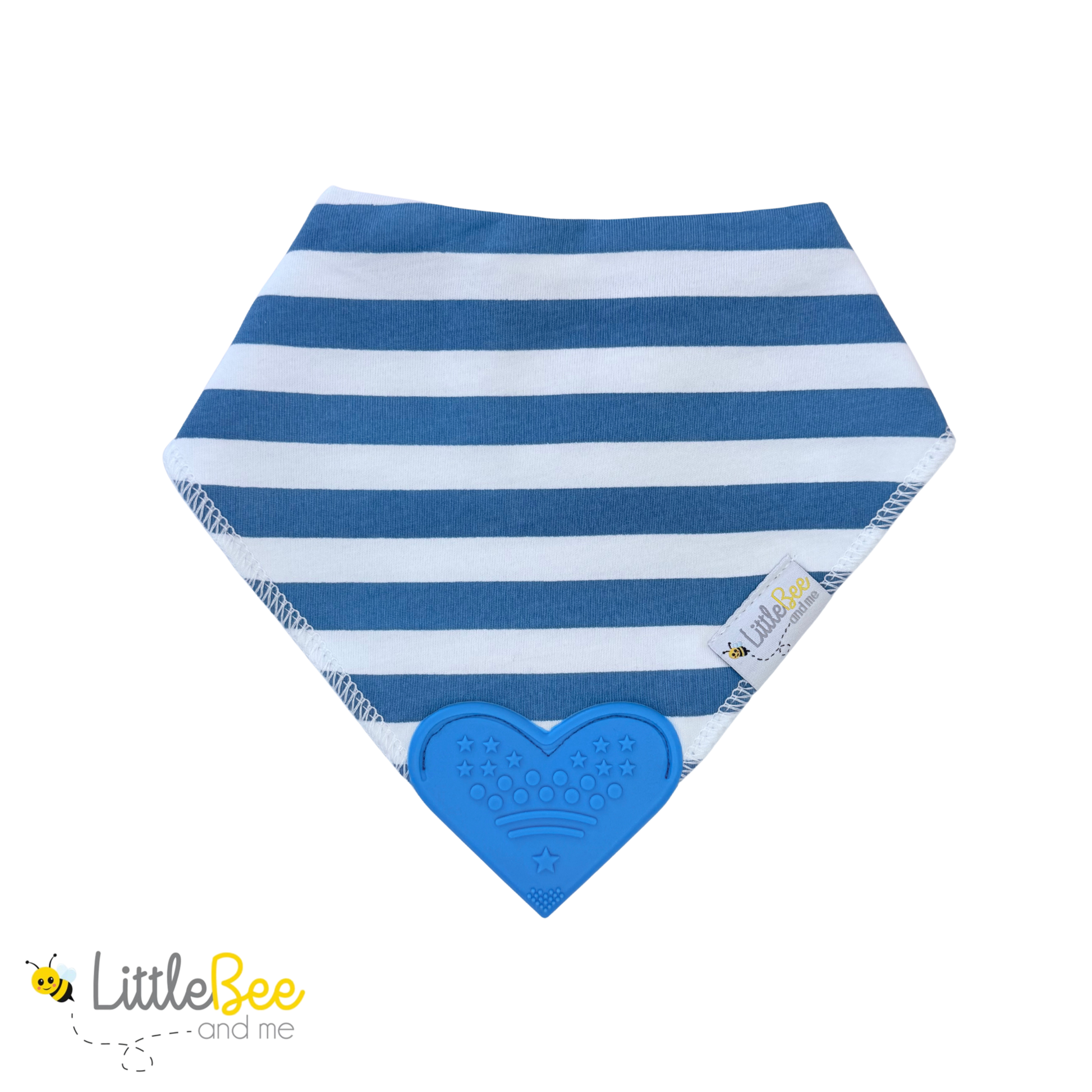 Say hello to Bumble & Bounce — a bold and playful set of four teether bibs in cool, vibrant tones. With a mix of crisp stripes and solid colours in blue, teal, green, and navy, each bib is finished with a bright blue heart-shaped silicone teether for easy, on-the-go relief.