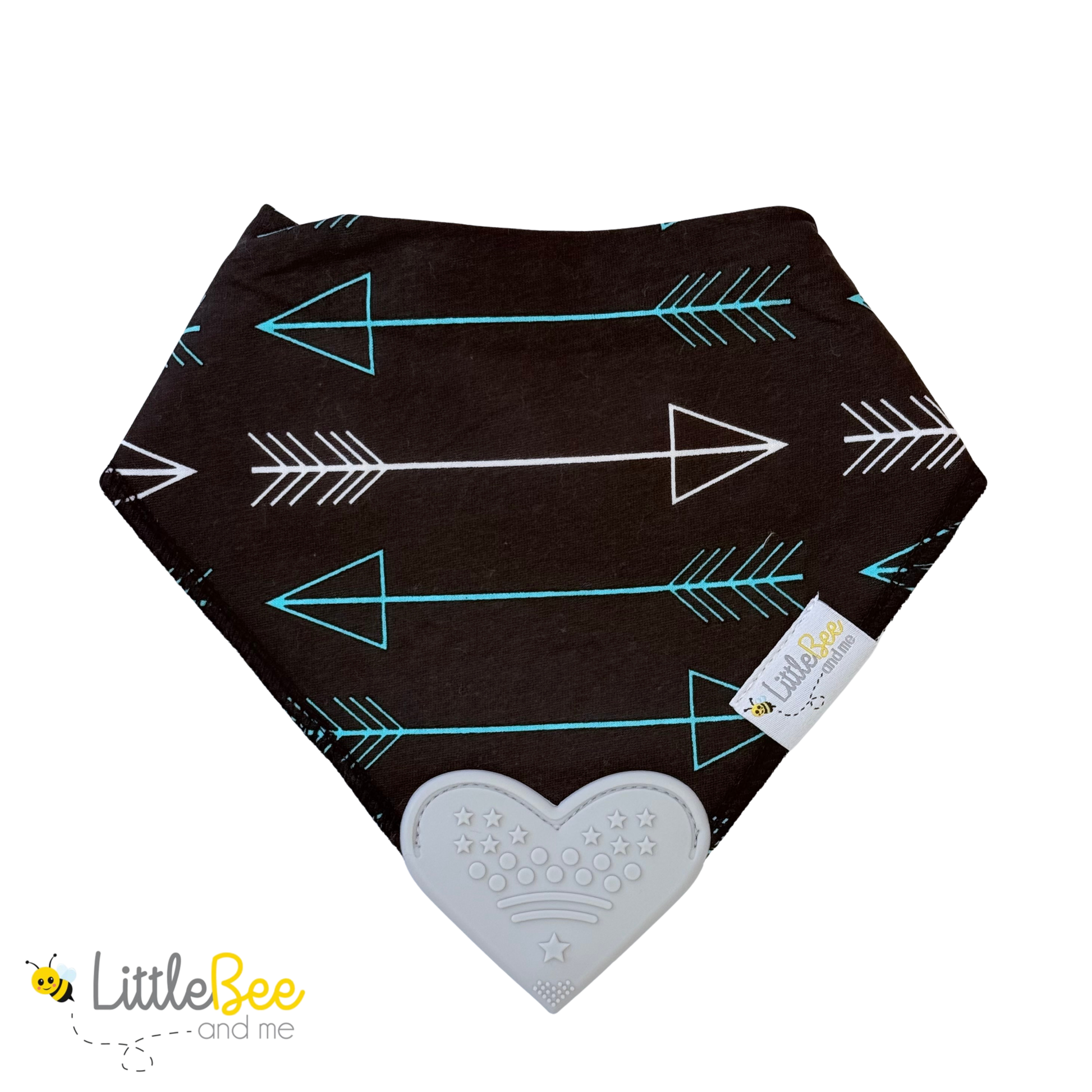 Say hello to Roar & Explore — a bold set of four teether bibs designed for tiny dino fans and little explorers. With a mix of playful dinosaur prints, arrows, and triangles in cool tones of teal, grey, black, and navy, each bib is finished with a soft heart-shaped silicone teether in grey or white — perfect for chomp-happy gums.